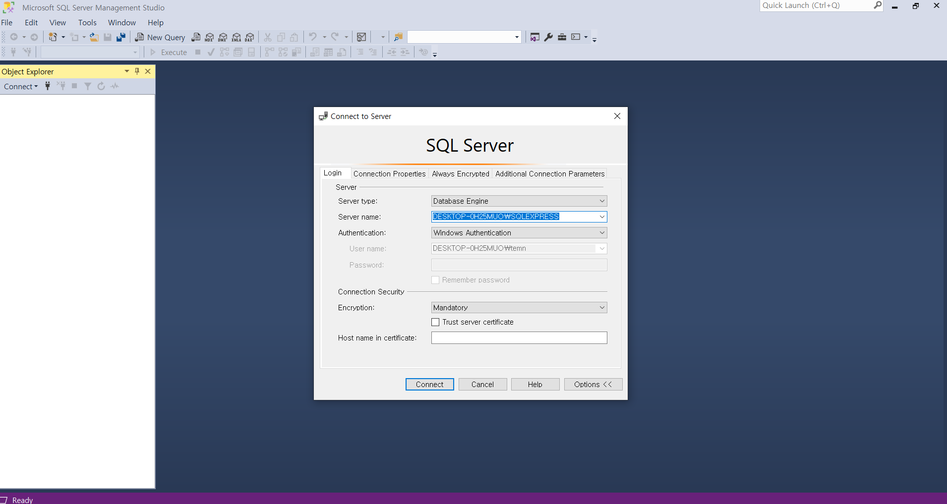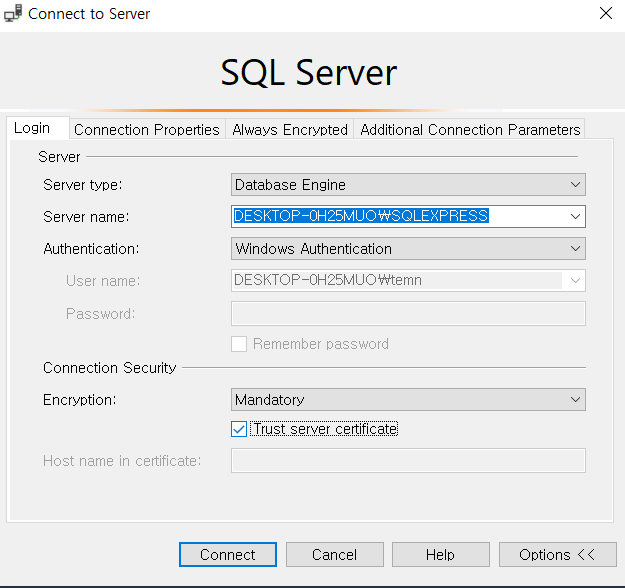2. Trust server certificate 옵션을 체크