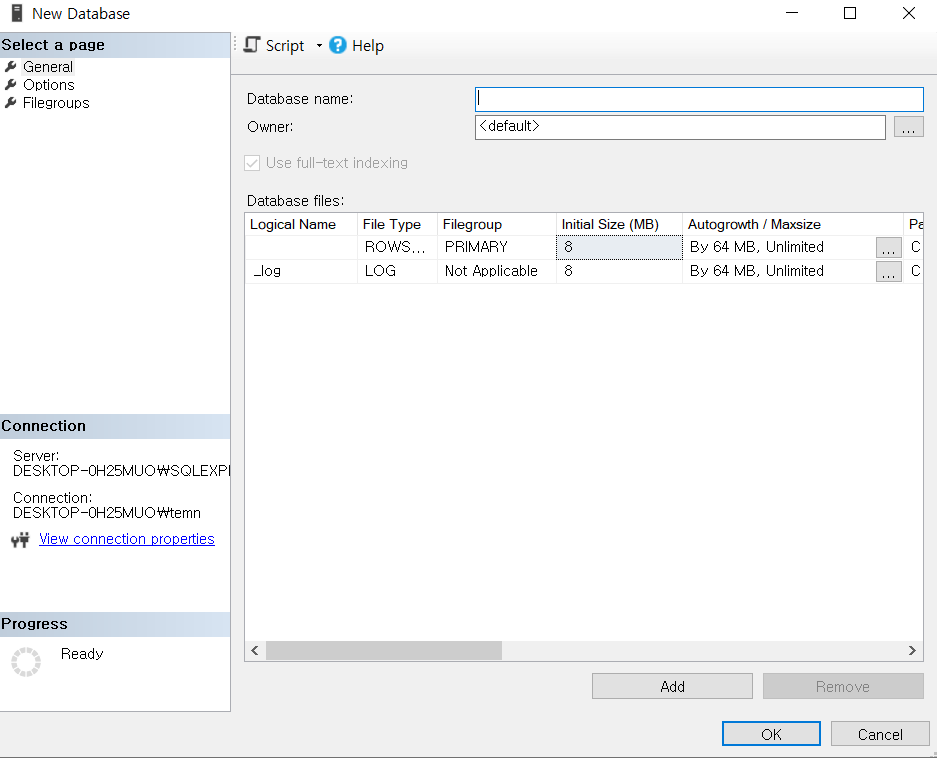 원하는 데이터베이스 이름 입력하고 OK 누르면